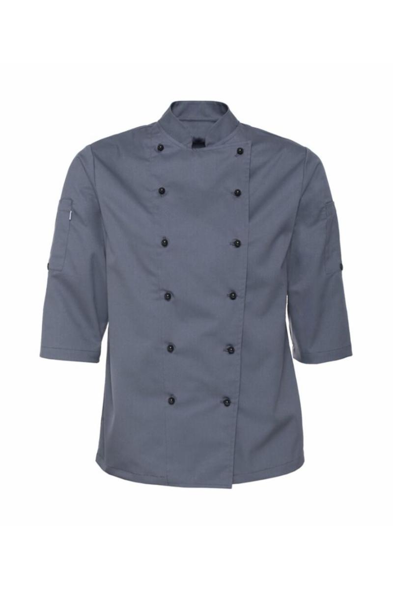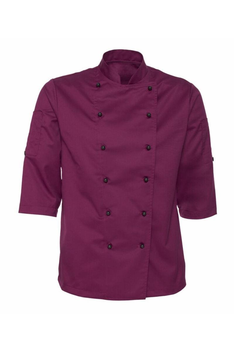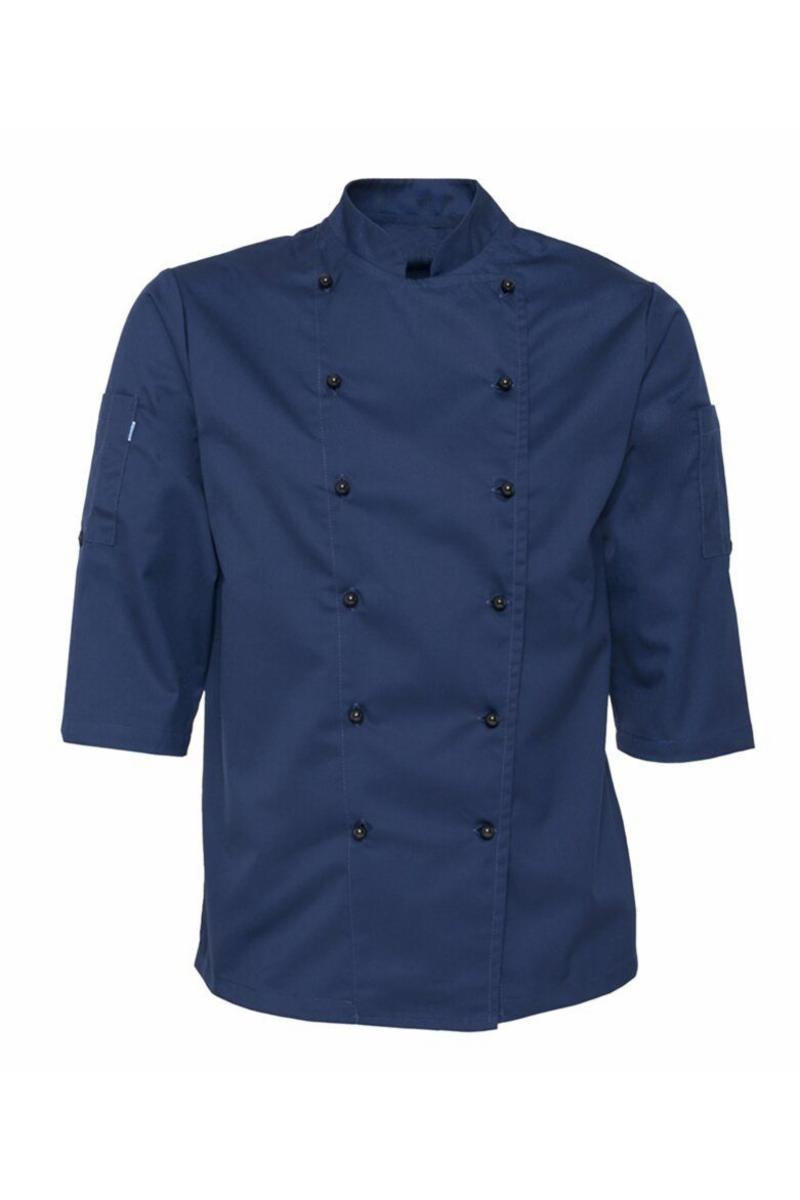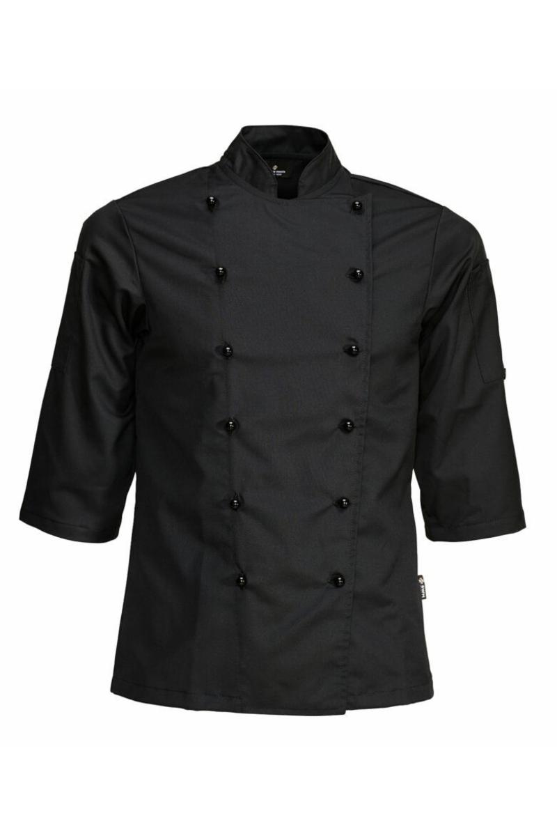 Behagelig kokkejakke med ¾ erme i comfort stretch twill. Hemper for oppbrett av ermer. Lommer på ermene. 12 knapper. Kokkejakken dobbeltspent og klaff kan kneppes mot høyre eller venstre. Lengde mi...