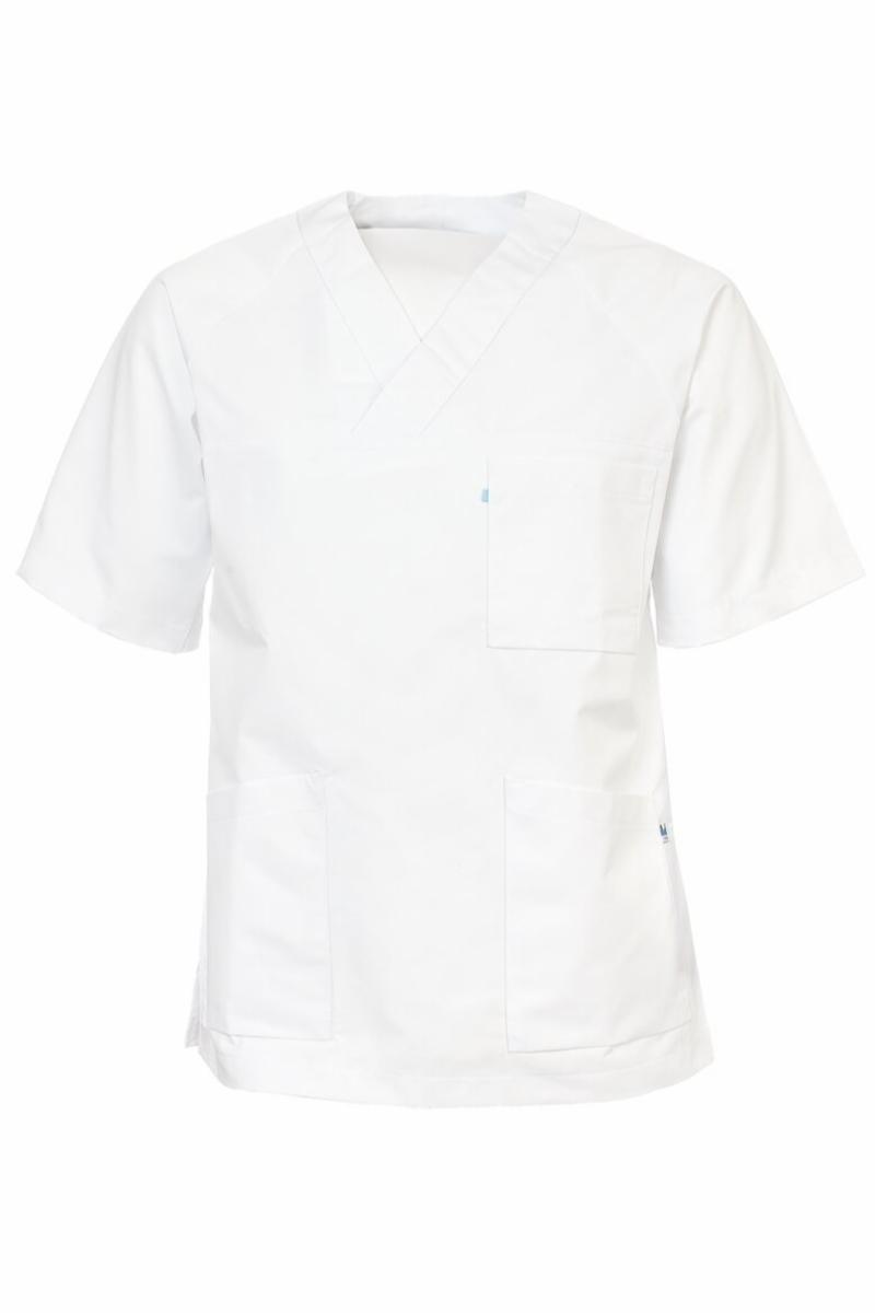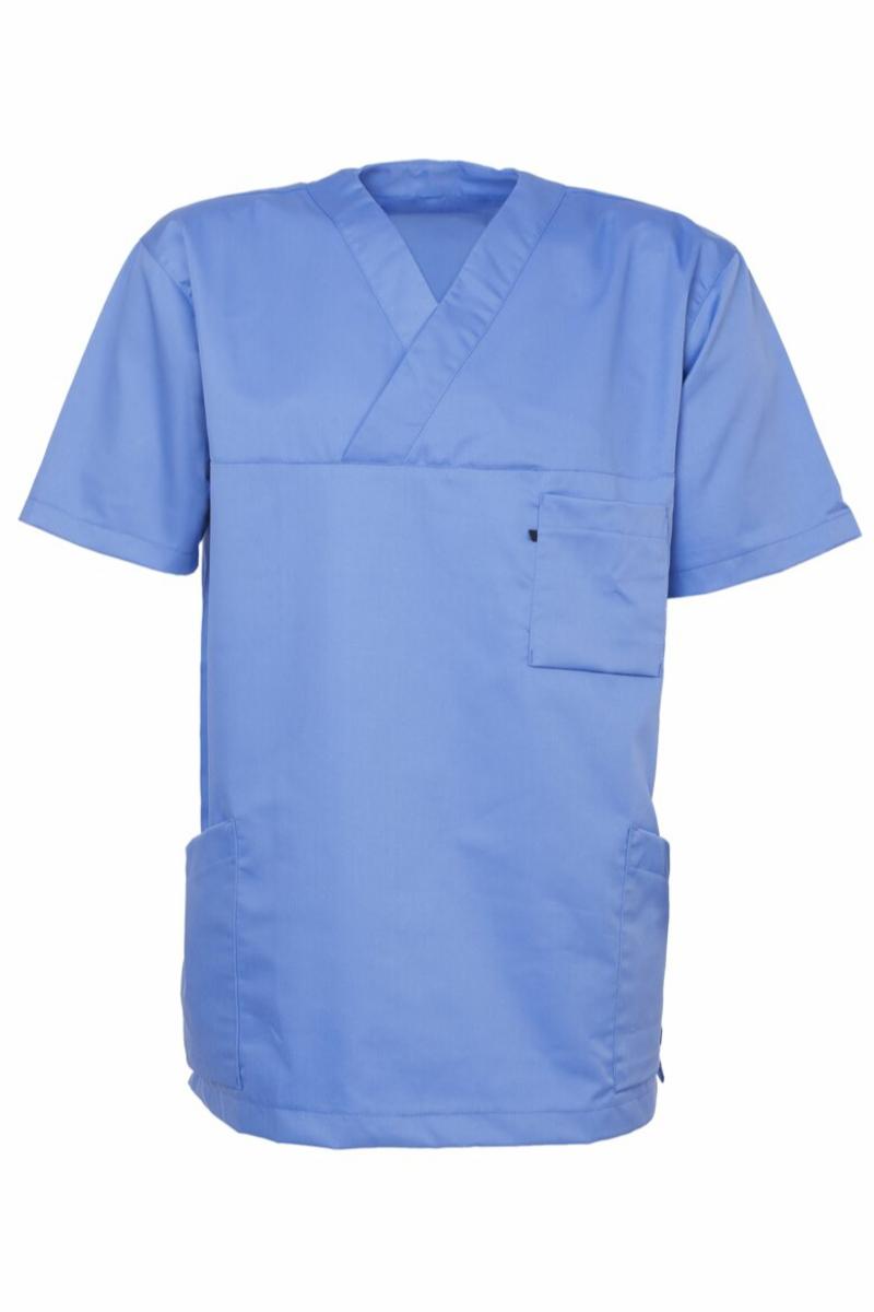 En litt lettere kittel med buet kort isydd erme og en brystlomme. To skråstilte sidelommer og splitt i sidene. V-hals. Kulørte kitler har nøkkelhempe i høyre lomme. Fargekodet størrelsesmerking på ...