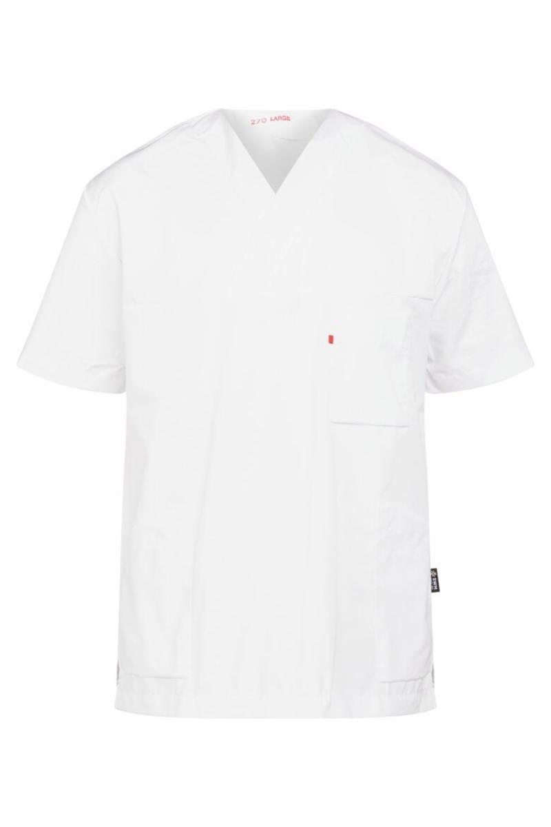 Kortermet kittel med V-hals og isydd erme. En brystlomme og to skråstilte sidelommer. Splitt i sidene. Fargekodet størrelsesmerking på brystlomme.