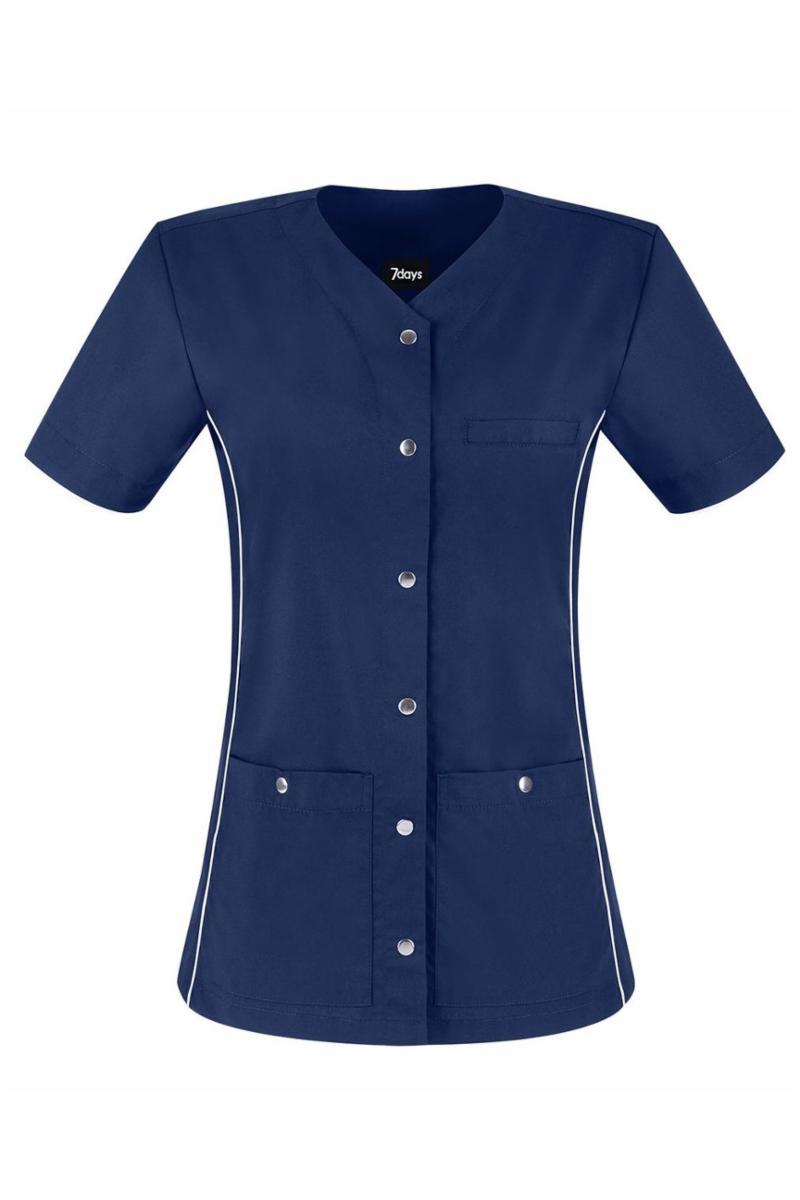 Formsydd dameoverdel med trykknapper, v-utskjæring og korte ermer. En brystlomme og to romslige hoftelommer med trykknapp, innvendig mobillomme og nøkkelstropp. Splitt i sidene.
