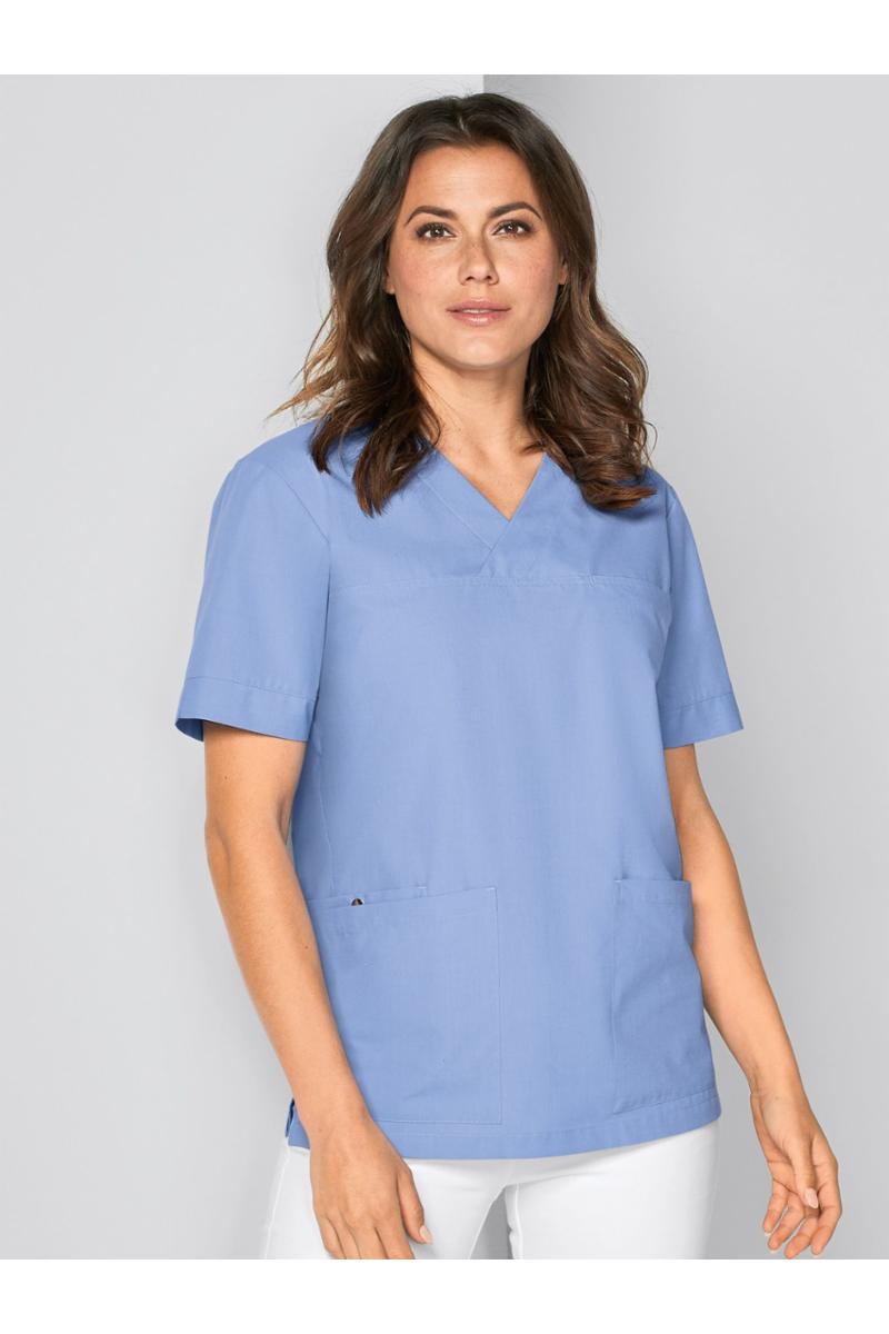 Unisex overdel med v-hals og korte ermer. En innvendig brystlomme samt to store lommer foran med innvendig mobillomme og nøkkelstropp. Splitt i sidene.