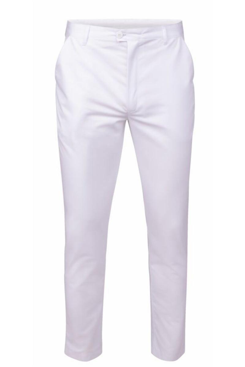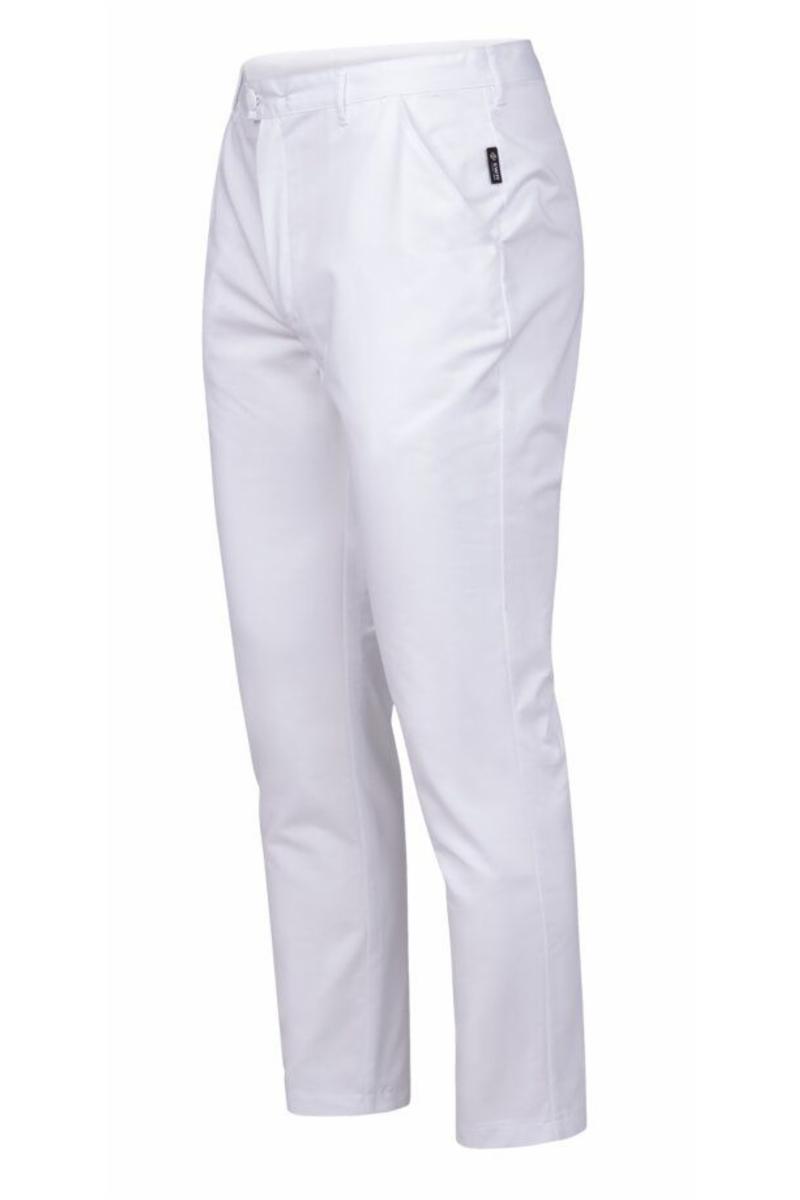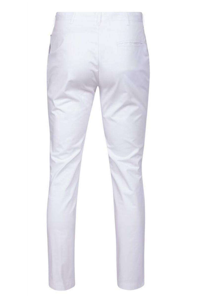 Funksjonell og komfortabel herrebukse i en pen smal modell. To stikklommer i siden og en passepoil baklomme. Knapp og glidelås i gylf. Beltehemper i linning.