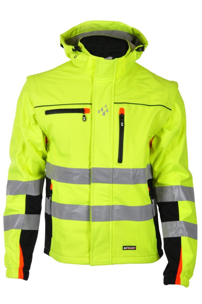 NOK 1500.00 Softshelljakke i moderne design. Pustende, vindtett og vannavisende materiale. Forlenget rygg. Høy krave. YKK® glidelås i front som går helt opp i kraven, klaff med borrelås og trykknapper. Fult justerbar avtakbar hette med to strammesnorer. Avtakbare ermer med glidelås. Brystlomme på venstre side med vertikal vanntett glidelås. Brystlomme på høyre side med horisontal vanntett glidelås og innvendig ID-kortlomme. To forlommer, begge med vanntett vertikal glidelås. Innvendige lommer.
