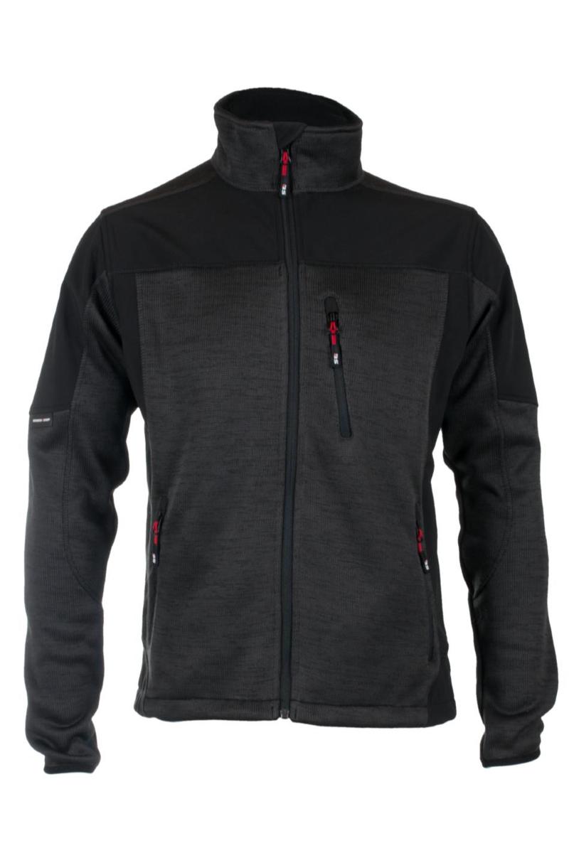 NOK 815.00 Jakke i strikket fleece. Kontraststoff i softshell i front, ermer, sidene og nedentil på rygg. Forlenget rygg. Høy krave med børstet fleece innside. YKK® glidelås i front som går helt opp i kraven. Lomme på venstre bryst med vertikal glidelås. To forlommer med vertikal glidelås. Elastisk strammesnor i linning. Ermeavslutning med elastikk, kantet med bånd. Nakkehempe. Materiale: 100% polyester, 380 g/m2.