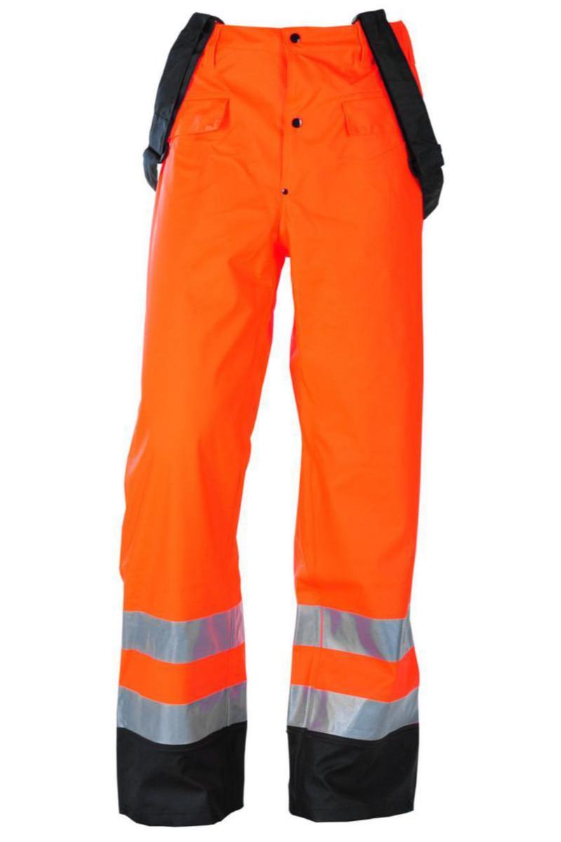 NOK 798.00 Regnselebukse med sveisede sømmer. Justerbare elastiske seler, avtakbare. Strikk, beltehemper og trykknapper i linning. To åpninger i front med klaff og trykknapper til hengelommer. Tommestokklomme med drenering. Trykknappregulering i benavslutning. Alle lommer forsterket med nagler i hjørnene. 50 mm refleksbånd på ben. Materiale: PU/PVC/polyester, 340 g/m2. Standard: EN ISO 20471 kl.3, EN 343:2003+A1:2007 3,1, EN ISO 14116:2015 Index