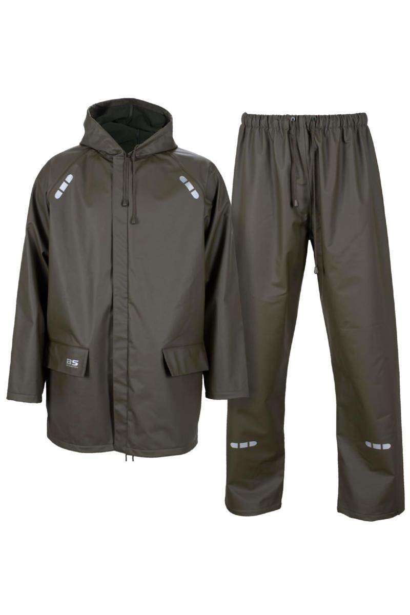 NOK 1435.00 Regnsett bestående av jakke og bukse. Regnjakke: Sveisede sømmer. Glidelås og stormklaff med trykknapper i front. Luftehull skjult av klaff øverst på rygg. Børstet innside. Hette med strammesnor. Forlommer, begge med klaff. Trykknappregulering i ermeavslutning. Strammesnor i linning. Nakkehempe. Regnbukse: Sveisede sømmer. Strikk og strammesnor i linning. Trykknappregulering i ben. Hempe innvendig bak i linning. Refleksdetaljer på jakke og bukse. Materiale: PU/polyester, 270 g/m2.