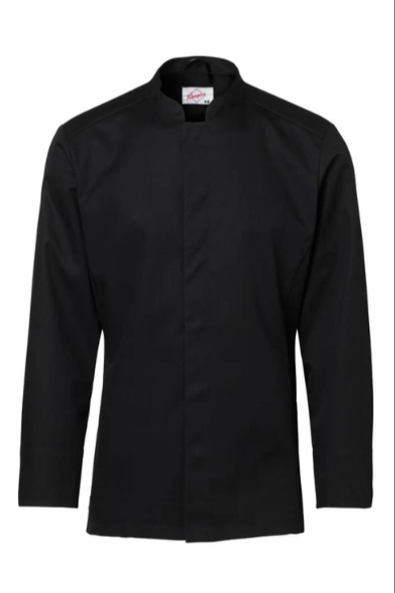 Moderne kokkejakke med lang arm med litt smalere passform til herre Skjult knepping med trykknapper Slitesterk kvalitet med holdbar farge