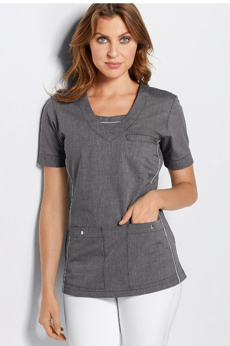 Formsydd dametunika med v-utskjæring, korte ermer og brystlomme. To romslige lommer foran, med trykknapp, innvendig mobillomme og nøkkelstropp. Splitt i sidene, 50% bomull/50% polyester, 140 g/m2.